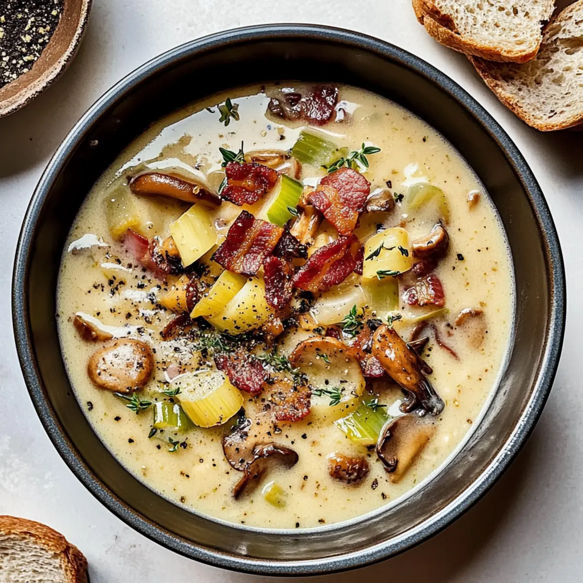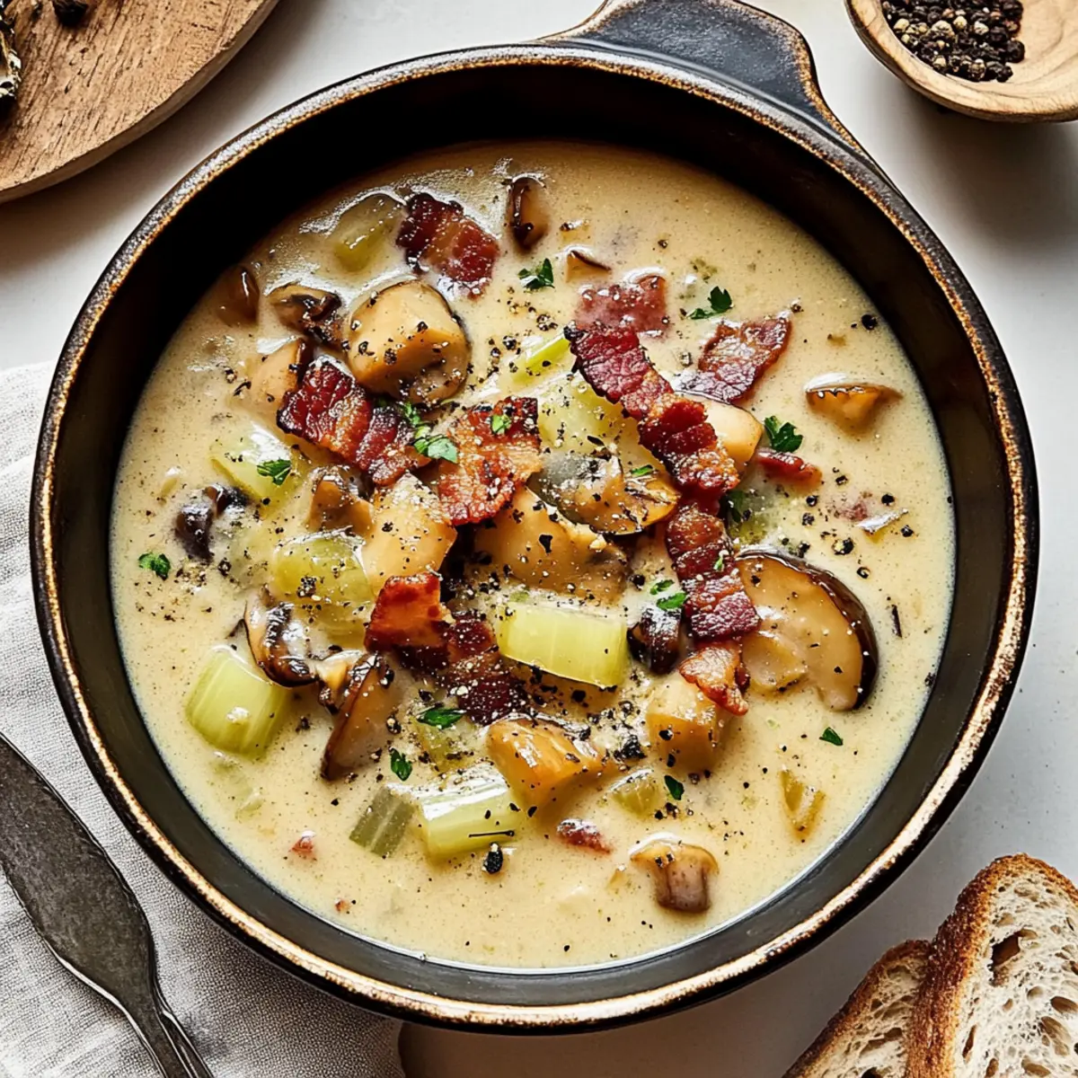 Beneath the rustling leaves of autumn, the comforting scent of wild mushrooms and smoky bacon can make even the crispest evening feel warm and inviting. This Creamy Wild Mushroom Chowder with Bacon and Leeks is more than just soup; it’s a cozy embrace in a bowl. With the earthy goodness of foraged chanterelles (or your favorite mushrooms) combined with the luscious richness of heavy cream, this one-pot meal transforms simple ingredients into culinary elegance. It’s the perfect way to elevate your weeknight dinners, striking a balance between hearty comfort and gourmet flair. Plus, it’s a quick prep that can please a crowd, making it an instant favorite at any gathering. What’s your secret to warming up on chilly nights? What makes this chowder so special? Creamy Comfort: The rich, velvety texture of this chowder warms your soul, making it an ideal meal for chilly evenings. Flavor Explosion: The combination of smoky bacon and earthy chanterelles creates a mouthwatering harmony that will delight your taste buds. One-Pot Wonder: Simple to prepare, this recipe reduces cleanup time, allowing you to focus on enjoying your delicious creation. Versatile Dish: Easily adaptable, try it with Garlic Cauliflower Mushroom or switch up the protein—vegetarian options are simple to incorporate! Crowd-Pleaser: Perfect for gatherings, this chowder impresses guests while providing the comforting feel of homemade food. Don’t forget, pairing it with crusty bread or a Spinach Mushroom Pasta can elevate the experience! Wild Mushroom Chowder Ingredients • Get ready to create a warming bowl of bliss! For the Chowder Bacon – Adds smoky flavor and richness; Substitution: Use turkey bacon for a lighter version. Butter – Provides richness and helps sauté vegetables; Substitution: Use olive oil for a dairy-free option. Leek – Brings sweetness and onion-like flavor; Prep Note: Use only the white and light green parts. Celery – Adds crunch and depth to the soup; Substitution: Can omit for a more focused mushroom flavor. Chanterelles (or mushrooms of choice) – Base of the chowder, offering earthy tones; Substitution: Any wild mushrooms like morels or even white button mushrooms can be used. Fresh Thyme – Introduces herbaceous notes; Optional: Use dried thyme if fresh is unavailable. Bay Leaf – Adds aromatic flavor during cooking; Do not consume; remove before serving. Flour – Acts as a thickener for the chowder; Substitution: Use cornstarch for a gluten-free option. Dry White Wine – Enhances flavor with acidity; Substitution: Use chicken or vegetable broth for a non-alcoholic option. Chicken Stock – Provides a savory base; Substitution: Use vegetable broth for vegetarian adaptation. Baby Yukon Gold Potatoes – Adds texture and heartiness; Substitution: Russet potatoes can also work but may alter the creamy texture. Sea Salt & Freshly Cracked Black Pepper – Seasoning for flavor balance; Adjust to taste. Ground Nutmeg & Cayenne Pepper – Adds warmth and depth; Optional spices can be adjusted based on preference. Heavy Cream – Provides velvety texture and richness; Substitution: Use coconut milk for a dairy-free option. This Wild Mushroom Chowder is sure to become a favorite. Gather your ingredients and let’s create a delightful dish that will warm your heart and soul! Step‑by‑Step Instructions for Creamy Wild Mushroom Chowder with Bacon and Leeks Step 1: Cook the Bacon In a large Dutch oven over medium heat, cook the chopped bacon until it’s crispy and the fat has rendered, about 8 minutes. Stir occasionally to ensure even cooking and prevent sticking. Once golden and aromatic, use a slotted spoon to transfer the bacon to a plate, leaving the rendered fat in the pot for added flavor. Step 2: Sauté the Vegetables Add 2 tablespoons of butter to the same pot over medium heat, allowing it to melt. Next, toss in the sliced leeks and diced celery, sautéing for about 5 minutes until softened and fragrant. Stir often to ensure even cooking, and watch for the leeks to turn translucent, enhancing the base of your wild mushroom chowder. Step 3: Add the Mushrooms and Herbs Raise the heat to medium-high and introduce the chopped chanterelles, fresh thyme, and a bay leaf to the pot. Stir frequently for around 3 to 5 minutes, allowing the mushrooms to soften and release their earthy aromas. Ensure the mixture is well combined, as this will infuse the chowder with depth and flavor. Step 4: Incorporate Flour Sprinkle in ¼ cup of flour, stirring continuously until it is fully incorporated into the vegetable mixture. Cook for approximately 2 minutes to eliminate the raw flour taste, ensuring a smooth base for your chowder. The mixture should become slightly thickened and cohesive, setting the stage for a creamy texture. Step 5: Deglaze with Wine Pour in 1 cup of dry white wine, scraping up any browned bits from the bottom of the pot as the liquid simmers. Allow it to reduce by half for about 3 to 5 minutes, creating a rich flavor that enhances your wild mushroom chowder. You’ll know it’s ready when the wine has evaporated and the mixture thickens slightly. Step 6: Add Stock and Potatoes Slowly pour in 4 cups of chicken stock, followed by the diced baby Yukon Gold potatoes, sea salt, freshly cracked black pepper, nutmeg, and a pinch of cayenne. Bring the mixture to a rolling boil before reducing the heat to a gentle simmer. Let it cook for about 15 minutes, or until the potatoes are tender and easily pierced with a fork. Step 7: Stir in the Cream Once the potatoes are perfectly tender, reduce the heat to low and gradually stir in 1 cup of heavy cream. Allow the chowder to heat through gently, ensuring not to boil it to prevent curdling. The chowder should be warm and velvety, inviting you to ladle it into bowls for serving. Step 8: Final Touches Taste and adjust the seasoning of your creamy wild mushroom chowder with additional salt or pepper if needed. Serve immediately, garnished with 