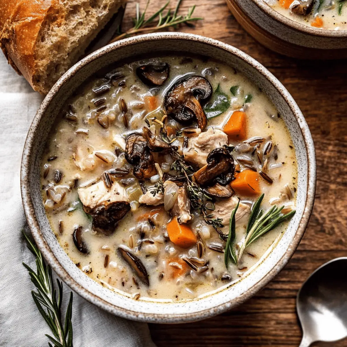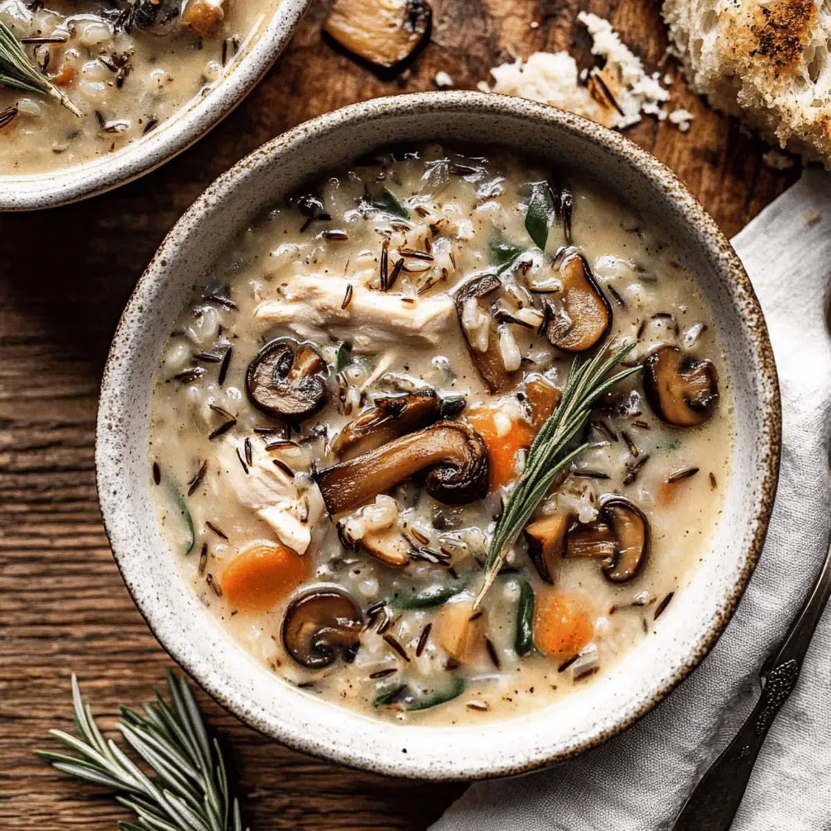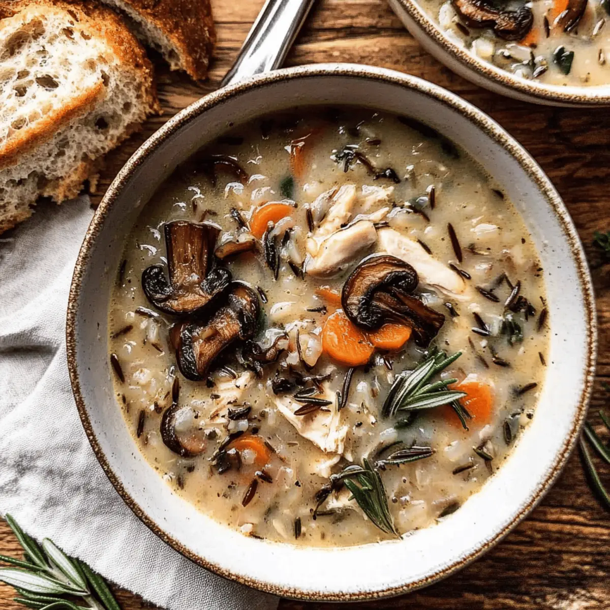 As I stood by the stove, the rich aroma of garlic and fresh herbs wafted through my kitchen, transporting me to a cozy cabin nestled in the woods. This is the beauty of my Creamy Wild Rice Chicken Soup with Roasted Mushrooms—it’s like a warm embrace on a chilly evening. The beauty of this dish lies not only in its heartwarming flavor but also in its versatility; whether you prefer the slow cooker, Instant Pot, or stovetop method, it guarantees a comforting meal with minimal effort. Full of tender chicken and earthy mushrooms, this soup is a heartening option for busy weeknights or leisurely weekends. Plus, it’s gluten-free, making it suitable for everyone at your table. Ready to elevate your comfort food game? Let’s dive into this delightful recipe that will surely become a family favorite! Why is this soup a must-try? Comforting and cozy: This Creamy Wild Rice Chicken Soup wraps you in warmth with every spoonful, making it perfect for chilly nights. Versatile preparations: Choose your favorite cooking style—slow cooker, Instant Pot, or stovetop—for an effortless meal that suits your schedule. Hearty ingredients: Packed with tender chicken, roasted mushrooms, and wholesome vegetables, it offers a satisfying and nutritious dish. Quick weeknight savior: With minimal prep and cooking time, this dish is an ideal option for busy evenings or long weekends. Gluten-free options available: Everyone can enjoy this delicious soup, making it a fantastic addition to any table, paired beautifully with a side of Cheesy Garlic Chicken or crusty bread. Wild Rice Chicken Soup Ingredients • Discover the essential components for this comforting dish! For the Soup Boneless Skinless Chicken Breasts – This is the primary protein source; feel free to substitute with turkey or tofu for a lighter option. Dry Wild Rice Blend – The heart of the soup, providing delightful texture; brown rice can work in a pinch, but adjust cooking time accordingly. Carrots & Celery – These vegetables add flavor and nutrition; you can easily substitute with bell peppers or other favorites. Shallots – These bring a sweetness and depth of flavor; if unavailable, onions make a suitable alternative. Low-Sodium Chicken Broth – This savory base brings everything together; switch to vegetable broth for a vegetarian-friendly version. Fresh Thyme & Sage – These herbs elevate the flavor profile; dried herbs can substitute if fresh aren’t available, but use less. Crushed Red Pepper Flakes – Add a hint of heat; simply adjust or omit to match your spice preference. Fresh Baby Spinach or Kale – These greens add color and nutrients; feel free to choose any leafy greens that you enjoy. Heavy Cream or Whole Milk – This creates a luxuriously creamy texture; coconut milk is excellent for a dairy-free alternative. Grated Parmesan Cheese – This ingredient adds rich flavor; for a vegan version, use nutritional yeast. Salt and Pepper – Essential for enhancing the dish’s overall flavor. Salted Butter – Use for roasting the mushrooms and bringing out flavors; oil can be a suitable dairy-free substitute. Mixed Mushrooms – A blend of mushrooms brings umami and texture; any combination you prefer will work beautifully. Fresh Rosemary & Garlic – These enhance the aroma and flavor of the roasted mushrooms; use garlic powder if fresh is not handy. Lemon Zest – This brightens up the entire dish; if you’re out of lemons, lime zest can step in. For the Roasted Mushrooms Mixed Mushrooms – A mix such as shiitake, cremini, or button mushrooms provides a rich, earthy flavor profile; you can use any variety based on your preference. Salted Butter – This adds richness; opt for oil if you’re seeking a dairy-free option. Fresh Rosemary & Garlic – These fragrant ingredients amplify the mushroom’s flavor; if fresh is unavailable, garlic powder and dried rosemary can work in a pinch. Lemon Zest – This little touch of brightness lifts the flavors beautifully; lime zest is a wonderful substitute if needed. Step‑by‑Step Instructions for Creamy Wild Rice Chicken Soup with Roasted Mushrooms Step 1: Prepare the Soup Base In your slow cooker, combine boneless skinless chicken breasts, dry wild rice blend, chopped carrots, celery, shallots, low-sodium chicken broth, and a sprinkle of fresh thyme and sage. Add a pinch of crushed red pepper flakes for mild heat and season with salt. Pour in enough water to cover the ingredients, then cook on low for 5-6 hours until the chicken is tender. Step 2: Shred the Chicken and Add Cream Once the cooking time is up, carefully remove the chicken from the slow cooker and shred it using two forks. Return the shredded chicken to the pot, then stir in heavy cream, grated Parmesan cheese, and fresh spinach. Let this creamy wild rice chicken soup simmer on low for an additional 30 minutes, allowing the flavors to meld beautifully. Step 3: Roast the Mushrooms Preheat your oven to 425°F (220°C). On a baking sheet, melt salted butter and toss in mixed mushrooms, minced garlic, chopped fresh rosemary, and lemon zest. Spread the mushrooms in a single layer and roast for 25-30 minutes. They should be golden brown and fragrant, adding a depth of flavor to your creamy soup. Step 4: Incorporate the Roasted Mushrooms Once the mushrooms are roasted, carefully stir them into the warm creamy wild rice chicken soup, incorporating any remaining butter from the baking sheet. This will enhance the soup’s richness and ensure the delicious umami flavor of the mushrooms is evenly distributed throughout. Step 5: Serve and Enjoy Ladle the creamy wild rice chicken soup into bowls, garnishing each serving with a sprinkle of fresh rosemary and additional Parmesan cheese if desired. This comforting soup pairs perfectly with crusty bread, making it a complete meal that is sure to warm your heart and soul! What to Serve with Creamy Wild Rice Chicken Soup with Roasted Mushrooms The vibrant, savory soup creates a be