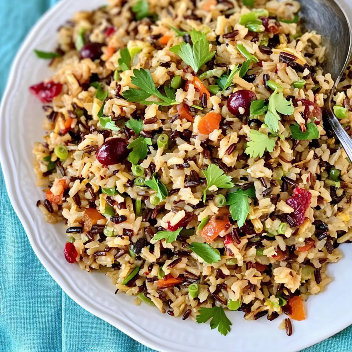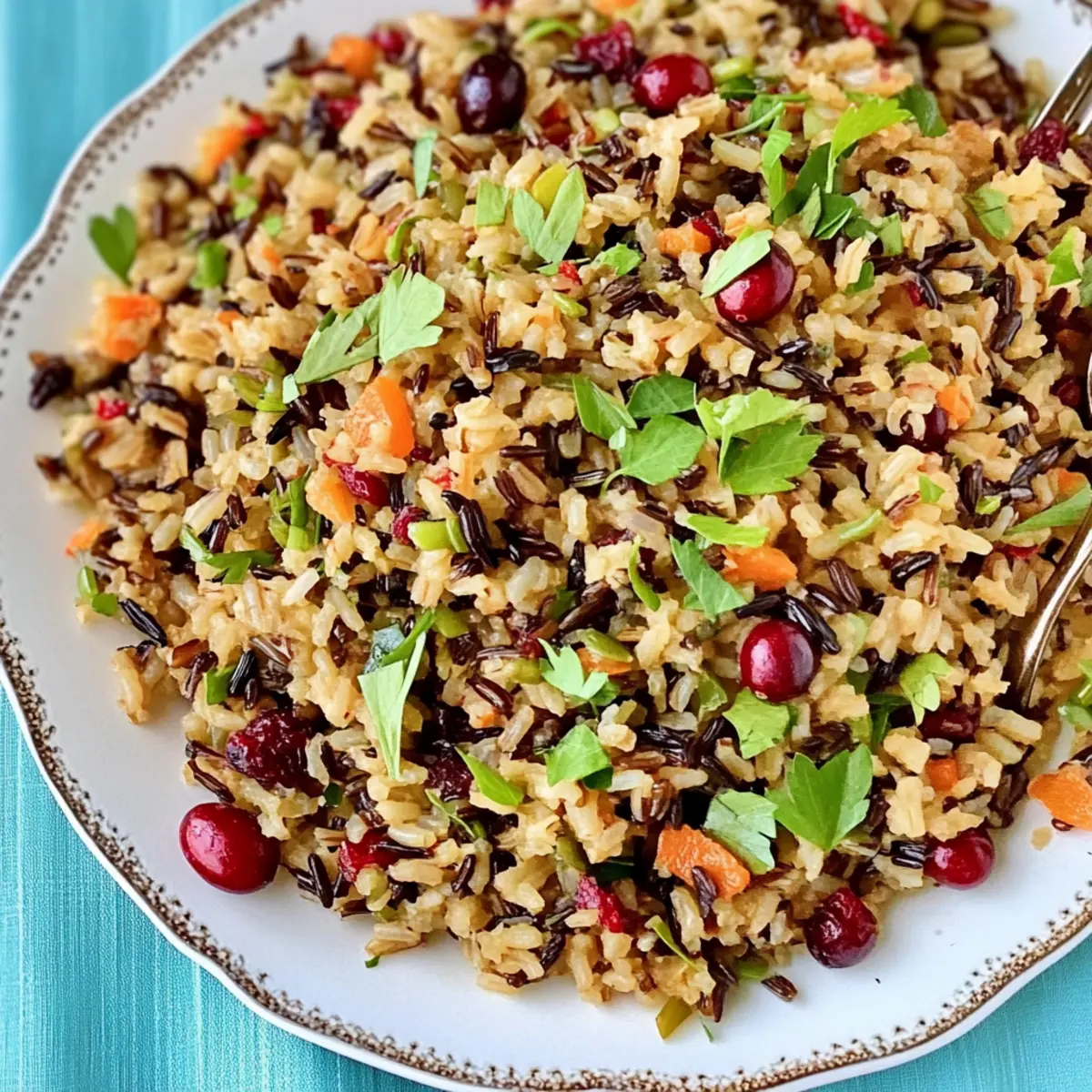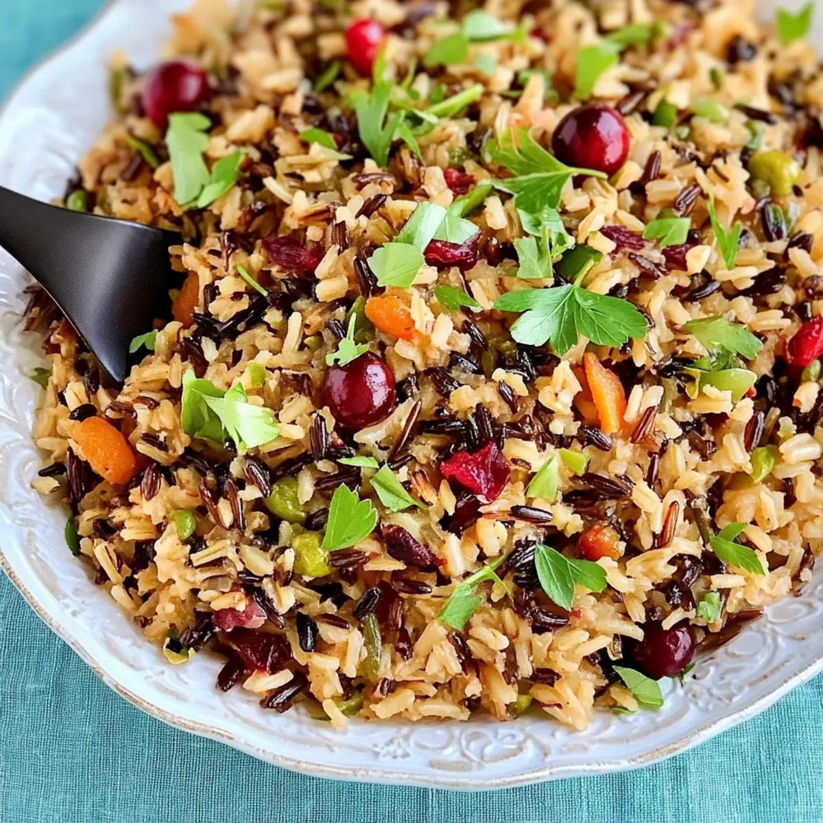The kitchen is alive with aromas that transport me to countless Thanksgiving feasts past; the moment I pull together this Thanksgiving Wild Rice Pilaf, it feels like I’m wrapping myself in the warm embrace of tradition. This fragrant vegan side dish, bursting with the sweetness of cranberries and the delicate harmony of fresh herbs, is a must-have at any holiday table. Not only does this wild rice pilaf elevate your festive spread, but it’s also simple enough to whip up on a weeknight for a nutritious meal. The delightful mix of sautéed vegetables and savory broth creates a dish that feels both comforting and special—perfect for gathering your loved ones around the table. Are you ready to bring this joyful blend of flavors to your next meal? Why is Wild Rice Pilaf Perfect for You? Flavorful, Festive Dish: This Thanksgiving Wild Rice Pilaf is packed with nutty grains and sweet cranberries, creating a mouthwatering combination of flavors perfect for any gathering. Vegan Delight: It’s a plant-based option that everyone will love, making it an inclusive dish for all your guests. Versatile Serving: Whether as a holiday side or a weekday meal, this pilaf is adaptable to any occasion. Pair it with options like Homemade Fried Rice or One Pot Rice for a complete feast. Eye-Catching Presentation: Vibrant colors of the veggies and cranberries bring your table to life, capturing attention and appetite alike. Nutritious Choice: With only 358 calories per serving, this dish is full of nutrients without compromising on taste—ideal for health-conscious eaters. Quick and Easy: Whip it up in less than an hour, allowing you more time to enjoy with family and friends. Wild Rice Pilaf Ingredients For the Base • Wild Rice Blend – Provides a nutty texture that forms the foundation of the pilaf. Note: Can be substituted with brown rice for a different flavor profile. • Low Sodium Vegetable Stock or Water – The cooking liquid recommended for controlling salt levels and enhancing flavor. For the Vegetables • Small Leek – Adds a mild sweet onion flavor when sautéed; remember to rinse well to remove any sand. • Bell Pepper – Contributes sweetness and color; any variety (red, yellow, or green) works beautifully. • Carrot – Grated for natural sweetness and vibrant color, ensuring even distribution in the dish. For the Flavor • Vegan White Wine – Elevates flavor complexity; can substitute with vegetable broth for a non-alcoholic option. • Dried Cranberries – Offer sweet-tart bursts that elevate the taste; extra cranberries can be used for garnish. • Bay Leaves, Rosemary, Sage, Thyme, Oregano – Fresh and dried herbs that impart aromatic flavor; adjust based on what you have available. • Red Pepper Flakes – Adds a hint of heat; use to taste according to your preference. For Cooking • Splash of Water or Olive Oil – Used for sautéing leeks; olive oil enhances the richness of your dish but is optional. Step‑by‑Step Instructions for Thanksgiving Wild Rice Pilaf with Cranberries and Fresh Herbs Step 1: Prepare the Vegetables Begin by preheating a large deep skillet over medium-low heat. While it warms, rinse and chop a small leek, then sauté it in a splash of water or olive oil with a pinch of salt. Cook until the leeks become translucent—about 5 minutes—stirring occasionally to prevent sticking. Step 2: Add Aromatics Next, grate a carrot and chop your choice of bell pepper. Stir in the grated carrot along with thyme, oregano, sage, rosemary, bay leaves, and a pinch of red pepper flakes into the skillet. Toast these ingredients together for an additional 2-3 minutes, letting the fragrances mingle before adding the wild rice blend. Step 3: Incorporate Wine and Cranberries Now, toss in the chopped bell pepper and half a cup of dried cranberries to the skillet. Pour in vegan white wine and increase the heat slightly to bring it to a simmer. Allow the mixture to reduce by half, which should take about 3-5 minutes, until it’s bubbling gently and fragrant. Step 4: Cook Rice Add low sodium vegetable stock to the skillet, bringing everything to a lively simmer. Once boiling, cover the skillet tightly with a lid and reduce the heat to low. Let the wild rice pilaf cook undisturbed for 50 minutes, allowing the rice to fully absorb the rich flavors of the broth and herbs. Step 5: Let Sit After 50 minutes, turn off the heat but keep the lid on to let the rice sit and steam for an additional 10-15 minutes. This resting period ensures that the rice finishes cooking and becomes fluffy, allowing all the flavors to meld together beautifully. Step 6: Finish and Serve Finally, carefully remove the lid and discard the bay leaves and any woody herb stems. Fluff the wild rice pilaf gently with a fork, allowing the ingredients to combine beautifully. Garnish with additional cranberries and fresh herbs for a vibrant touch, serving warm or cold for your festive gathering. What to Serve with Thanksgiving Wild Rice Pilaf The holidays are a time for celebration, and this comforting side dish deserves a grand feast alongside it. Roasted Root Vegetables: The earthiness of roasted carrots, parsnips, and sweet potatoes beautifully complements the nutty flavors of the pilaf. Their caramelized edges add a delightful crunch to your meal. Cranberry Sauce: Enhance the sweet-tart notes of the pilaf with a spoonful of homemade cranberry sauce. It’s the perfect pairing for that festive zing! Sautéed Brussels Sprouts: These crispy, bitter greens balance the pilaf’s sweetness while adding a touch of sophistication to your plate. Toss them with a bit of balsamic glaze for a rich depth of flavor. Herbed Vegan Gravy: A rich, savory gravy drizzled over the pilaf takes it to another level. It adds moisture and enhances every bite, making it an unforgettable experience. Stuffed Acorn Squash: With their natural sweetness, stuffed acorn squashes filled with grains and nuts echo the wild rice pilaf’s flavo