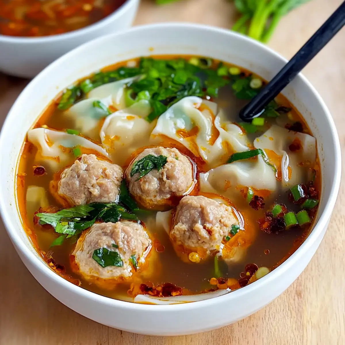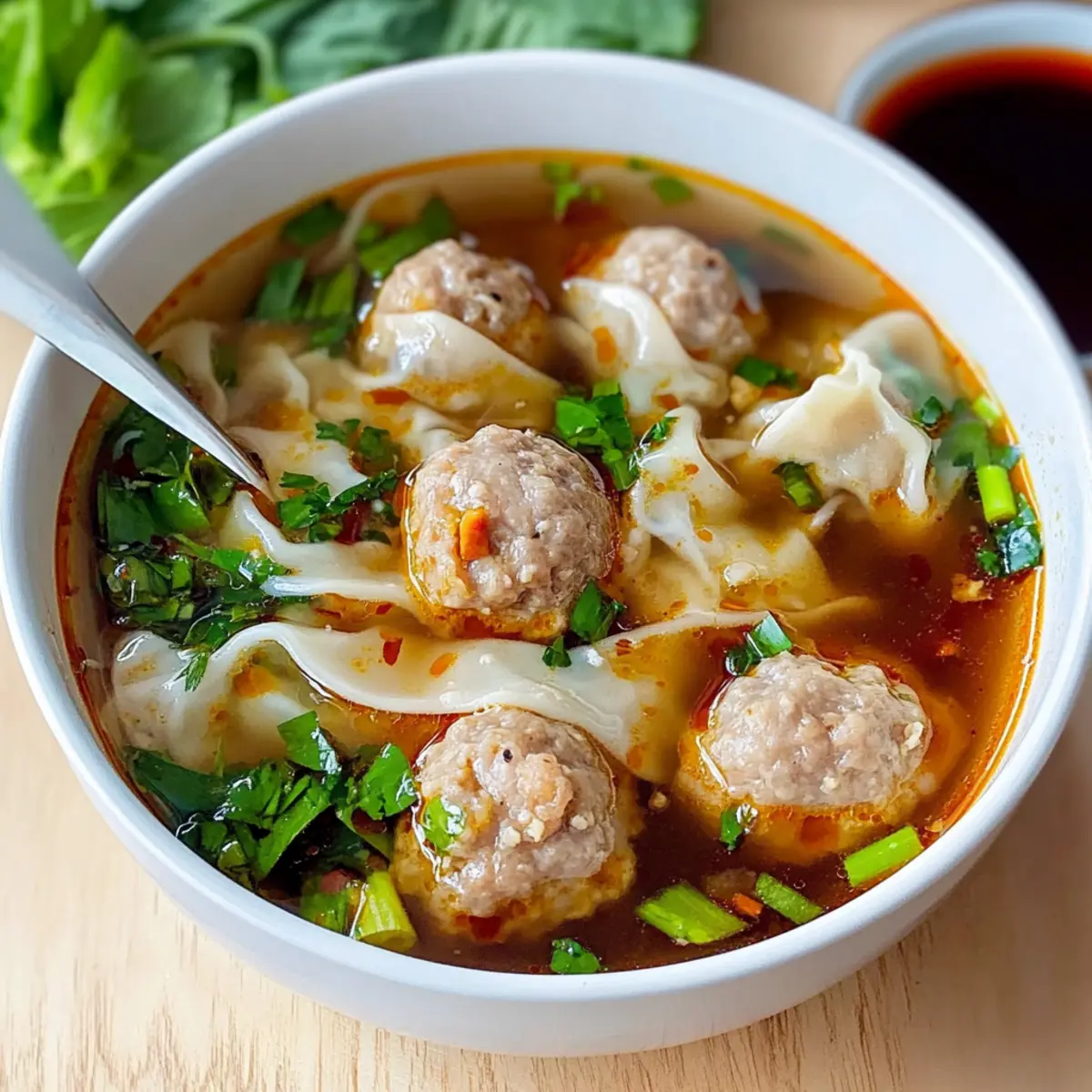 As I glanced at the clock, I realized dinner was just 30 minutes away, and I had a craving for comfort. That’s when I decided on a delightful bowl of Deconstructed Wonton Soup. This speedy, one-pot recipe brings together juicy pork meatballs, silky wonton wrappers, and a savory broth that warms the soul—all in just 25 minutes! With no fuss over complicated dumpling preparations, this dish is perfect for busy weeknights when you want homemade goodness without the hassle. Plus, it’s freezer-friendly, making it a fantastic option for meal prep or unexpected guests. So, are you ready to dive into a bowl of cozy flavor that will have your family asking for seconds? Why Is This Wonton Soup So Special? Comforting at its core, this Deconstructed Wonton Soup brings warmth and satisfaction to your dining table, all while staying quick and convenient. Versatile and adaptable, you can easily swap in different proteins or veggies based on what you have on hand—work with ground chicken or seasonal greens for a delightful twist! Flavor-packed, every bowl is full of rich broth and tender meatballs, making it a surefire crowd-pleaser. Plus, it’s a one-pot wonder, minimizing cleanup and time in the kitchen. Don’t miss the opportunity to elevate your weeknight meals with this cozy, no-fuss option that’s perfect for the whole family. If you’re in the mood for more comforting flavors, check out my Red Pepper Soup for another easy win! Wonton Soup Ingredients For the Meatballs • Pork Mince – Juicy and flavorful; using ground pork makes the meatballs tender and delicious. • Seasonings – Mix in garlic, ginger, salt, and pepper for an aromatic flavor boost to the meatballs. For the Broth • Chicken or Vegetable Stock – The flavorful base; always use a well-seasoned stock for depth. • Soy Sauce or Tamari – Adds the essential umami that enhances the overall taste of the Wonton Soup. For the Soup • Wonton Wrappers – Adds texture and heartiness; can be easily substituted with cut egg roll wrappers if needed. • Greens (e.g., Bok Choy or Spinach) – Brings a fresh, nutritional element; feel free to use shredded cabbage for variation. For Serving • Chili Oil – A touch of spice; while optional, it’s highly recommended to bring an exciting kick to your soup. • Scallions (Spring Onions) – Fresh garnish that elevates flavor and presentation, adding a pop of color to your bowl. This Deconstructed Wonton Soup is not only quick and easy to prepare, but it also delivers delightful flavors that make dinner a joyous occasion for everyone. Enjoy and savor each comforting bite! Step‑by‑Step Instructions for Wonton Soup Step 1: Prepare the Dumpling Filling In a mixing bowl, combine the pork mince with garlic, ginger, salt, and pepper. Use your hands to mix until everything is evenly blended, then shape the mixture into small meatballs, approximately 15 pieces. These flavorful meatballs will be the heart of your comforting Wonton Soup. Step 2: Simmer the Broth In a large pot, pour in the chicken or vegetable stock and bring it to a rolling boil over medium-high heat. Once boiling, reduce the heat to a gentle simmer. This rich broth will be the foundation of your Wonton Soup, so it’s essential to use a well-seasoned stock for maximum flavor. Step 3: Add Meatballs Carefully drop the prepared meatballs into the simmering broth, making sure to space them out evenly. Allow them to cook for about 10 minutes, or until they are fully cooked through and have risen to the surface. Watch for their golden-brown color; this signifies they’re ready to enhance your Wonton Soup. Step 4: Incorporate Wrappers Once the meatballs are cooked, start adding the wonton wrappers one by one into the pot. Stir gently to prevent them from sticking together. Let the wrappers simmer for about 2-3 minutes until they soften and become tender, adding an inviting texture to your mouthwatering Wonton Soup. Step 5: Incorporate Greens After the wonton wrappers have softened, stir in your choice of greens, such as bok choy or spinach. Cook for another 2 minutes until the greens are wilted and vibrant. This step not only adds nutrition but also a lovely visual appeal to your comforting Wonton Soup. Step 6: Serve Ladle the hot Wonton Soup into individual bowls, ensuring everyone gets a generous share of meatballs, wrappers, and greens. Garnish each bowl with finely chopped scallions and a drizzle of chili oil for an extra kick. Your family will be delighted as they dig into this cozy, hearty dish! How to Store and Freeze Wonton Soup Fridge: Store any leftover Wonton Soup in an airtight container in the fridge for up to 3 days. Reheat gently on the stovetop with a splash of broth to revive its flavor. Freezer: To freeze, pour the cooled Wonton Soup into freezer-safe containers, leaving some space for expansion. It can be frozen for up to 3 months. Thawing: When ready to eat, thaw overnight in the refrigerator or use the microwave’s defrost function. Reheat on the stovetop for the best texture and flavor. Serving Tip: For the best experience, add fresh greens and a drizzle of chili oil just before serving, even if you’ve frozen the Wonton Soup. Expert Tips for Wonton Soup Properly Season the Broth: Always taste your stock before adding meatballs; a well-seasoned broth is crucial for delicious Wonton Soup. Add Wrappers Gradually: To avoid sticky messes, add wonton wrappers one at a time, stirring gently between additions. Customize Your Greens: Feel free to experiment with different greens like kale or napa cabbage for added nutrition and flavor in your Wonton Soup. Reheat with Care: If storing leftovers, reheat gently on the stovetop and add a splash of broth to refresh the soup’s flavor and texture. Experiment with Proteins: For variety, substitute ground pork with chicken or turkey; each option brings its own unique taste to your comforting Wonton Soup. Make Ahead Options Prepping your Deconstructed Wonton Soup